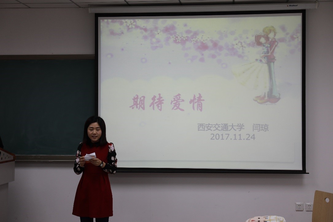 步入大学殿堂后,随着心理和生理上的发展和成熟,大学生们自然而然的对爱情产生了向往和关注,爱情也无疑是大学生最为关注同时也最为困惑的话题之一。为此,11月24日晚,硕7048班在中二2241举行了以“树立健康恋爱观,培养积极人生观”为主题的大学生心理健康活动。活动邀请了心理咨询教师、陕西省心理卫生秘书闫琼,并由心理委员郑梦园主持。
