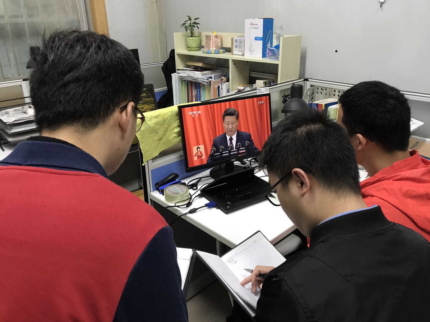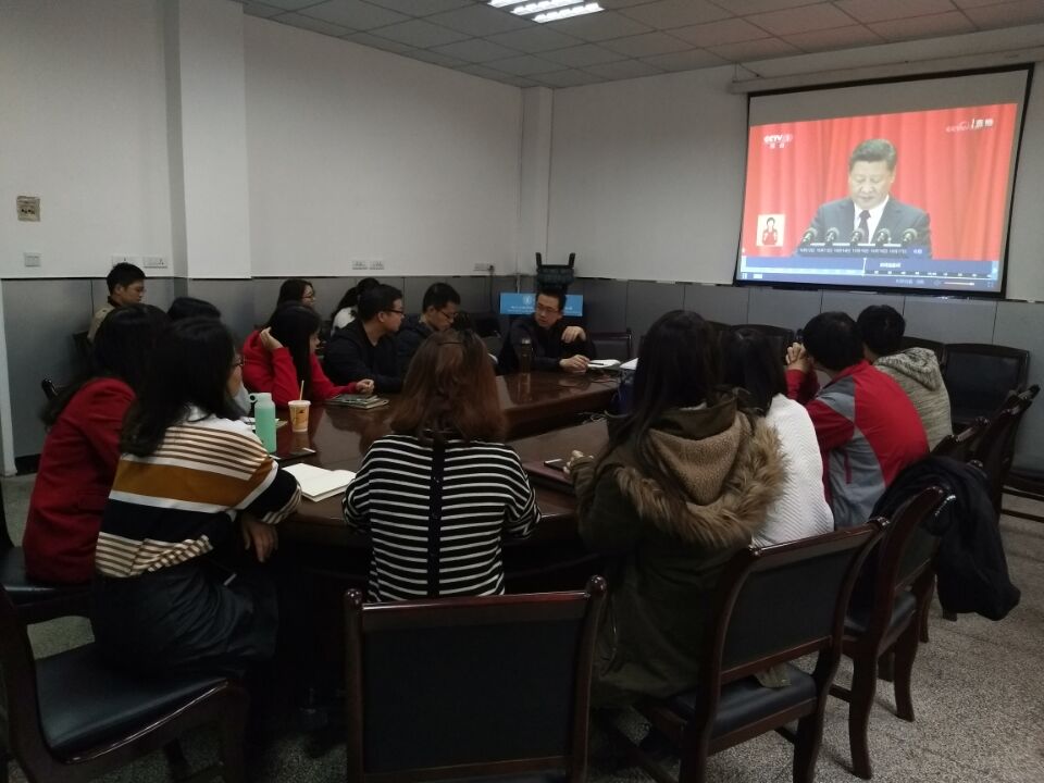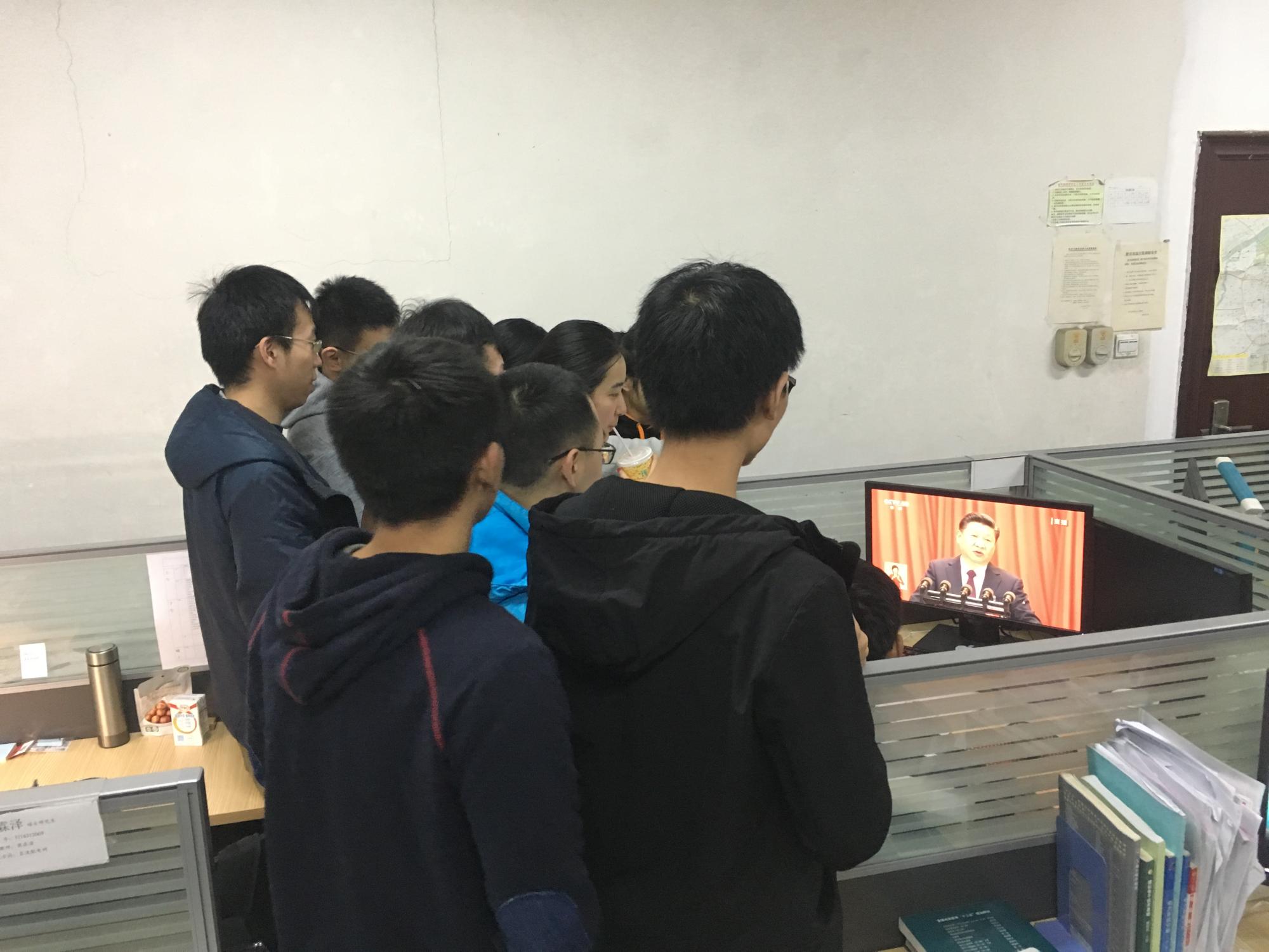 在不同地点,各学生党支部的同学们凝视着大屏幕,认真学习此次十九大开幕式的内容,深入地了解近几年中国共产党的成绩和进步。