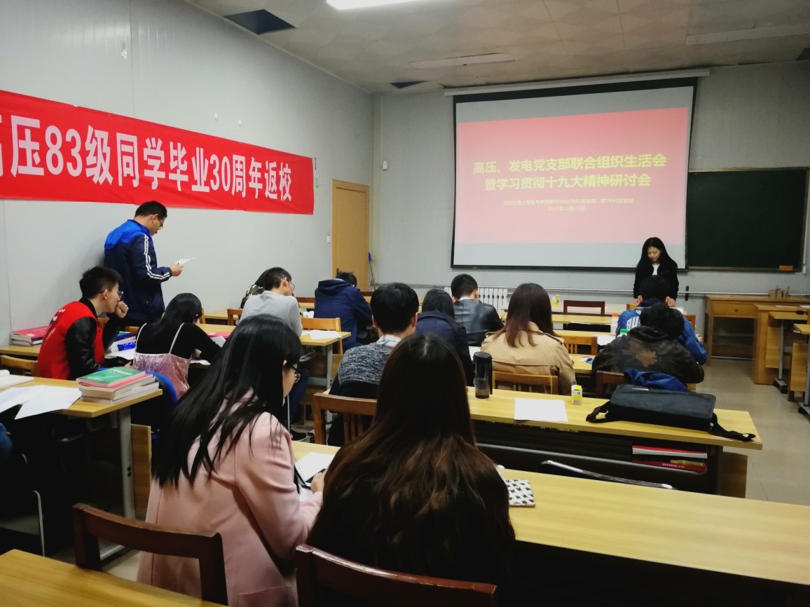 2017年10月24日晚,硕7039/41班党支部和7043班党支部在高电压技术教研室联合举行了主题为“学习贯彻十九大精神”的组织生活会。