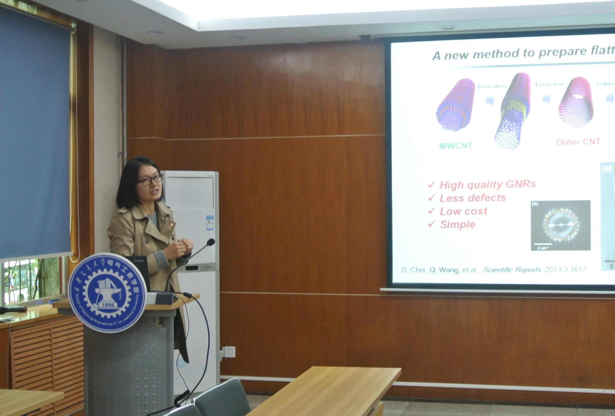 目前于日本东京大学从事博士后研究员工作的王青博士,她主要进行有关石墨烯、碳纳米管等新型纳米材料的制备及其场效应晶体管器件的设计与研究。她在会议中介绍了碳纳米材料的制备、特性与应用的相关情况。
